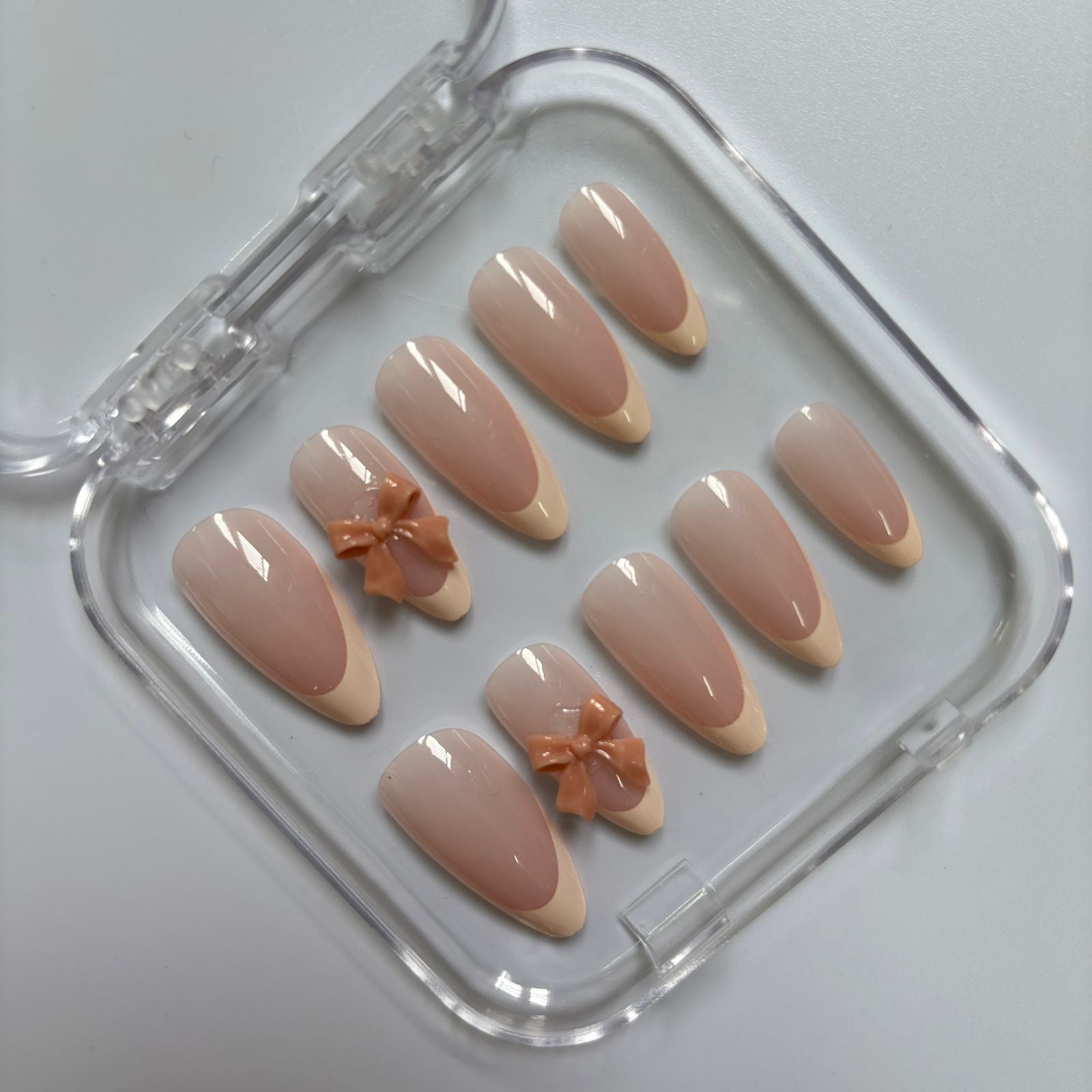 Sweet Brown Bow Press-On Nails - Nude Ombre Luxury Set (Size M)